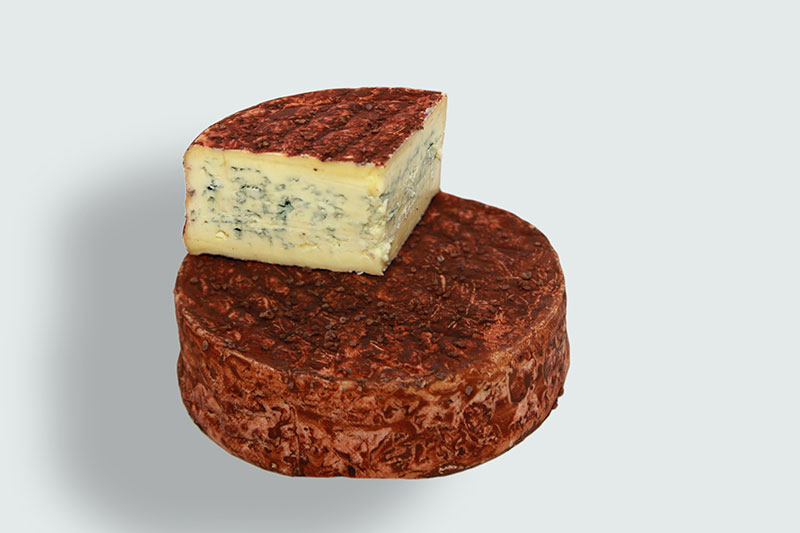 Der Blu de Cacao ist ein Edelpilzkäse, der aus einer Biokäserei in Backenholz stammt. Der Käse wird in unserem Haus verfeinert. Gestoßene Kakaobohnen werden über Nacht in jamaikanischem Rum eingelegt. Am nächsten Tag wird der Käse mit Rum und Kakaopulver abgerieben. Anschließend werden die eingelegten Kakaobohnen über den Käselaib verteilt.
