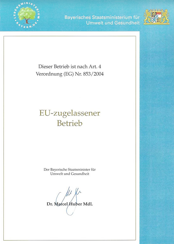 Seit dem Jahre 2012 sind wir nun ein sog. "EU-zugelassener Betrieb". Diese Zertifikation ist uns aufgrund unserer eigenen, wie auch der stetig steigenden Ansprüche unserer Kunden sehr wichtig. Nicht nur, dass wir regelmäßigen Kontrollen seitens der Behörden unterliegen, zusätzlich lassen wir durch externe Labore regelmäßig Hygiene-und Produktkontrollen durchführen. Durch höchste Sorgfalt und Kontrolle wollen wir uns und unseren Kunden, die bestmöglichste Qualität garantieren. |